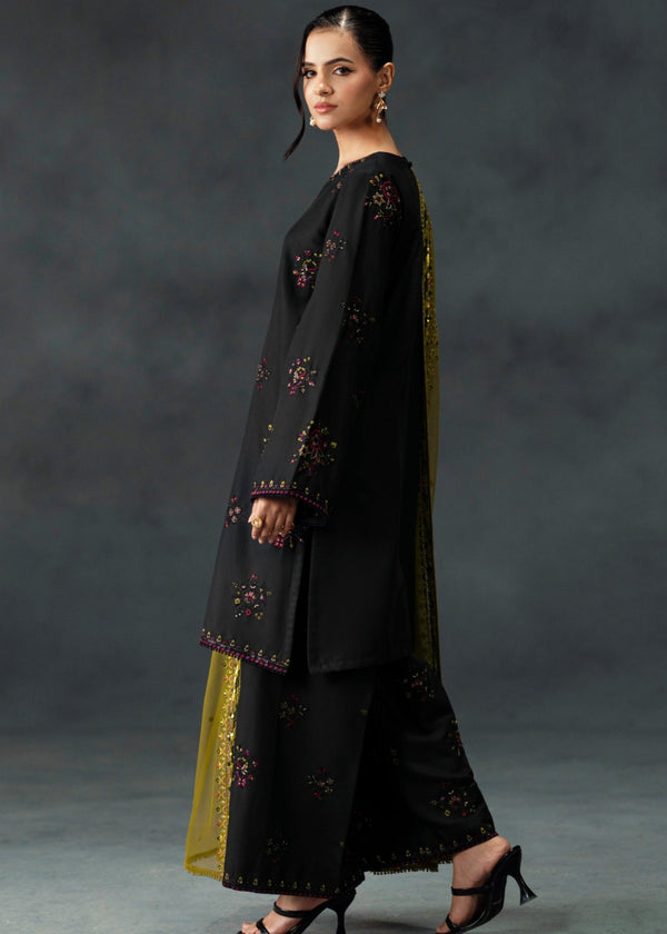 Noir Zara – Black Embroidered Linen 3-Piece Set with Net Dupatta